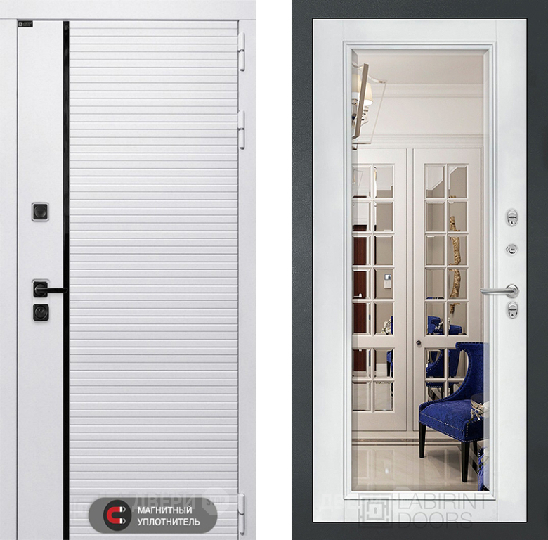 Входная Дверь Лабиринт (LABIRINT) Royal Зеркало Фацет с багетом Белый софт 860x2050 мм
